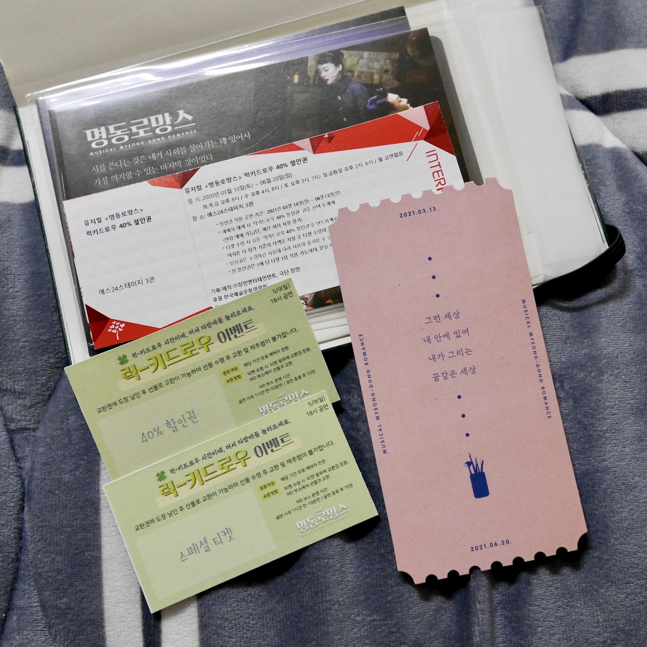 뮤지컬 '명동로망스' 자다섯 했습니다. 이번 주에는 럭키드로우 이벤트가 있었는데... 저는 스페셜 티켓과 40% 할인권을 받았습니다. 마침 재관 도장 3회를 채웠기에 40% 할인권이 추가로 더 생겼습니다. 할인권이 생겼으면 쓰는 것이 인지상정! ㅋㅋ